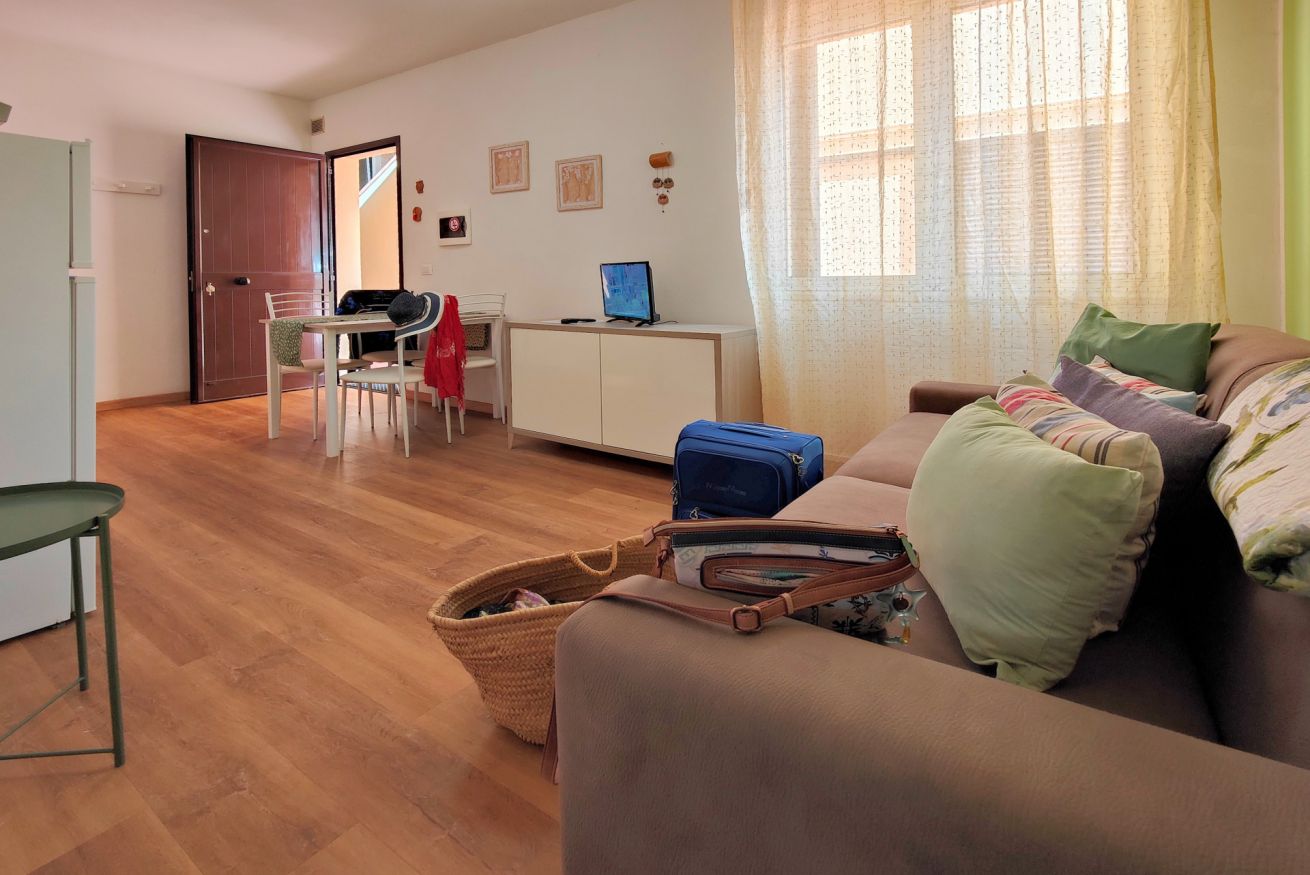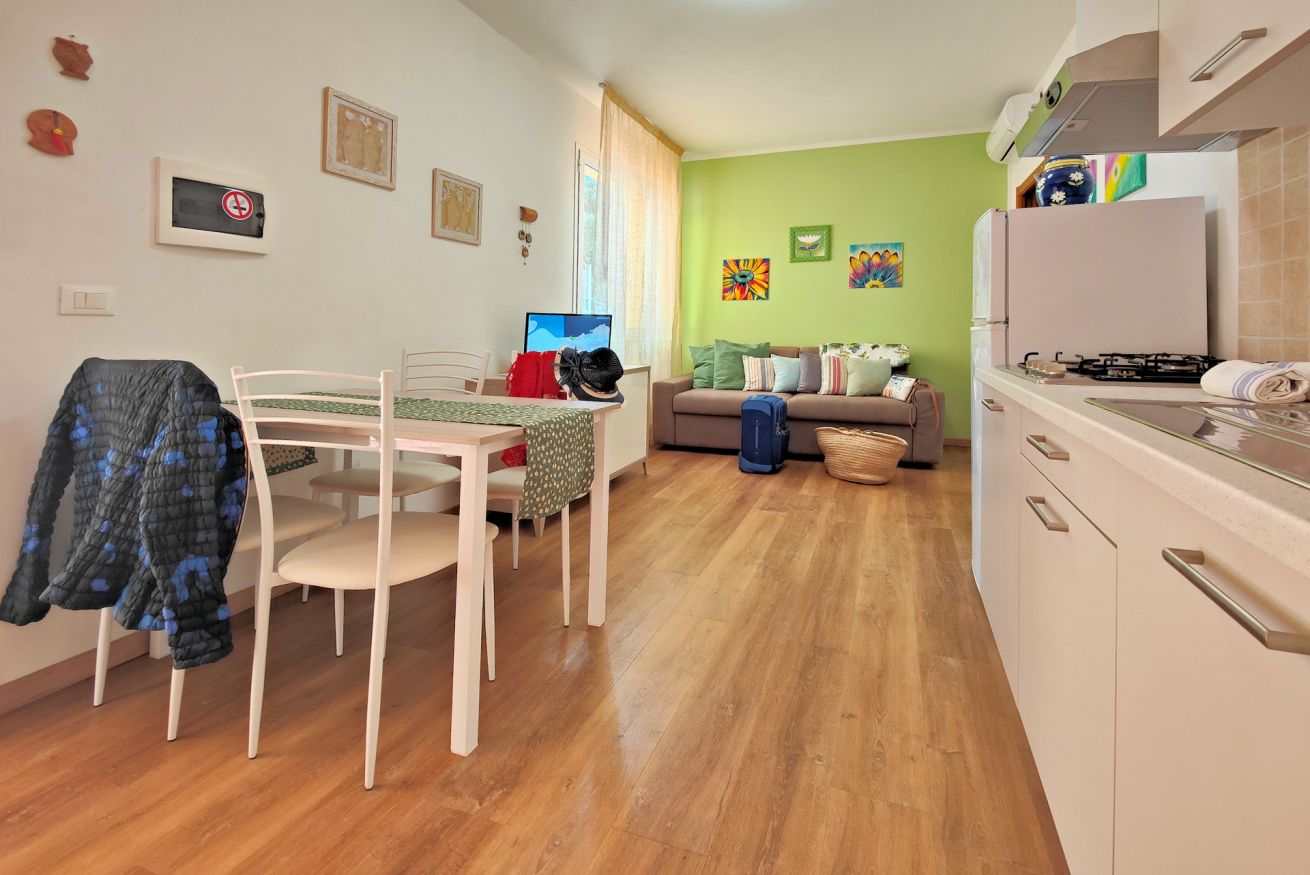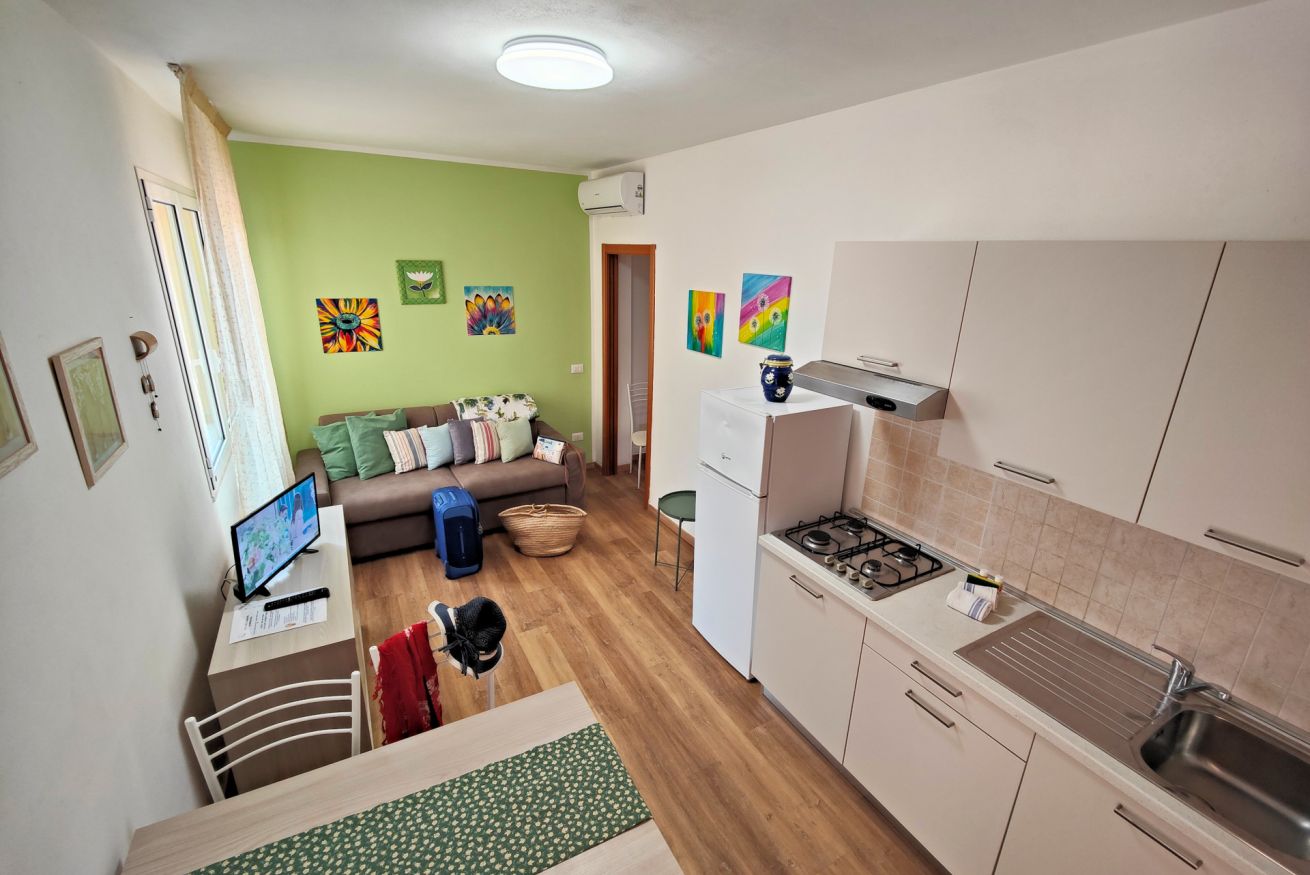 Consigliamo gli appartamenti bilocali situati al piano terra alle famiglie con uno o due bambini piccoli e ai viaggiatori con difficoltà nel salire le scale perché offrono un accesso all'alloggio senza impedimenti. Questi appartamenti, seppur non abbiano un’area esterna di pertinenza hanno la facilità d’uso della terrazza comune della struttura, che offre una piacevole vista sulla spiaggia e sul mare, e dove si trovano lettini e sdraio.